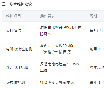 设置合理充电电压,浮充电压建议≤2.25V/单体(20℃),防止极板活性物质脱落。
